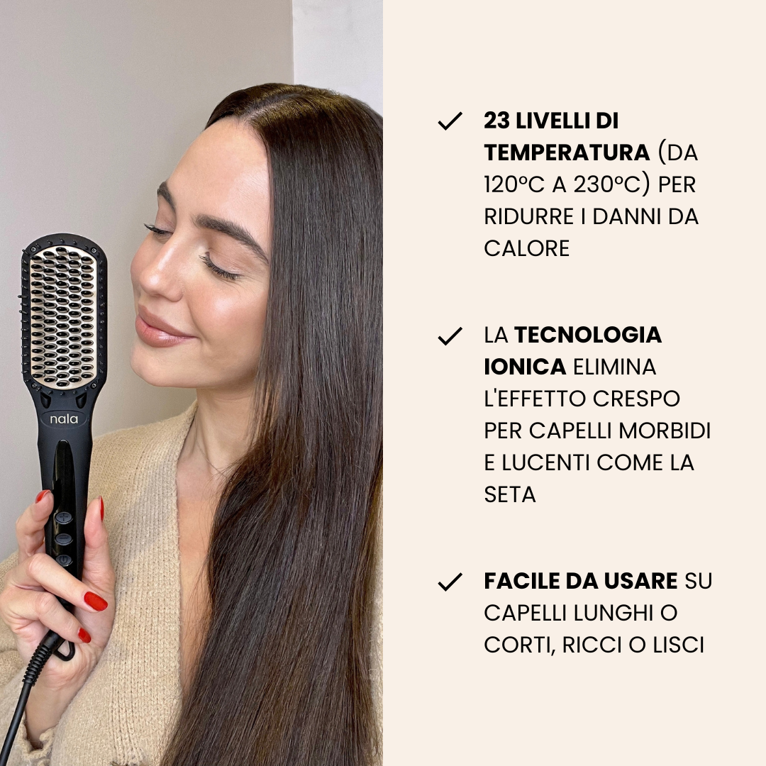- Riduci i danni da calore: capelli diversi hanno bisogno di temperature diverse, non esiste un'unica temperatura che si adatta a tutte. Per questo la nostra spazzola lisciante ha 23 livelli di temperatura da 120°C (Capelli sottili o danneggiati) a 230°C (Capelli spessi o difficili da acconciare).